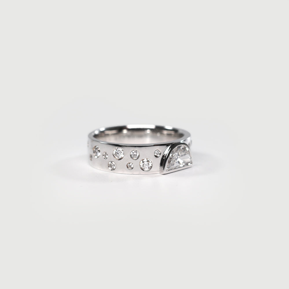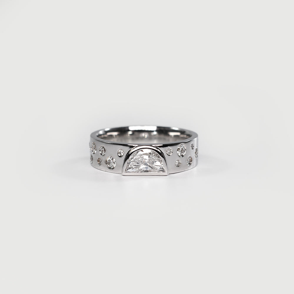 Inspired by the enchanting beauty of the moon, this ring glimmers with round diamonds, gracefully arranged to reflect the soft, luminous glow of moonlight and its celestial charm.