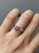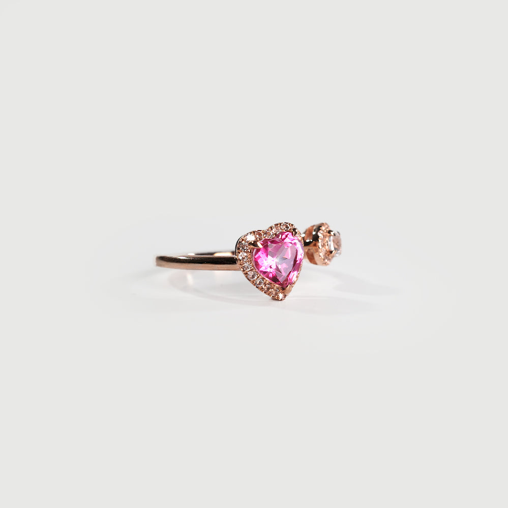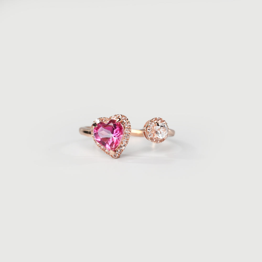 This open ring features a pink topaz heart paired with a round stone, inspired by the classic 'Toi et Moi' design. A romantic symbol of two elements in perfect harmony, it exudes timeless elegance with a modern twist.