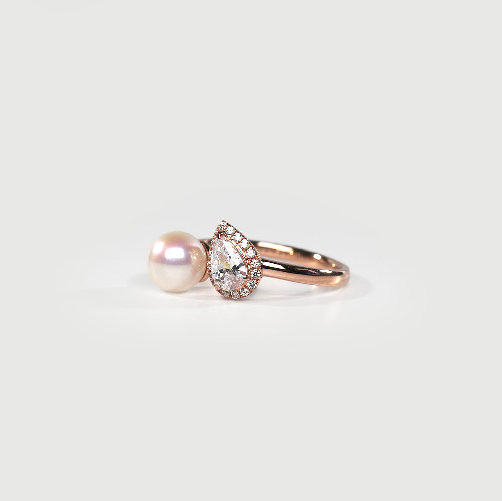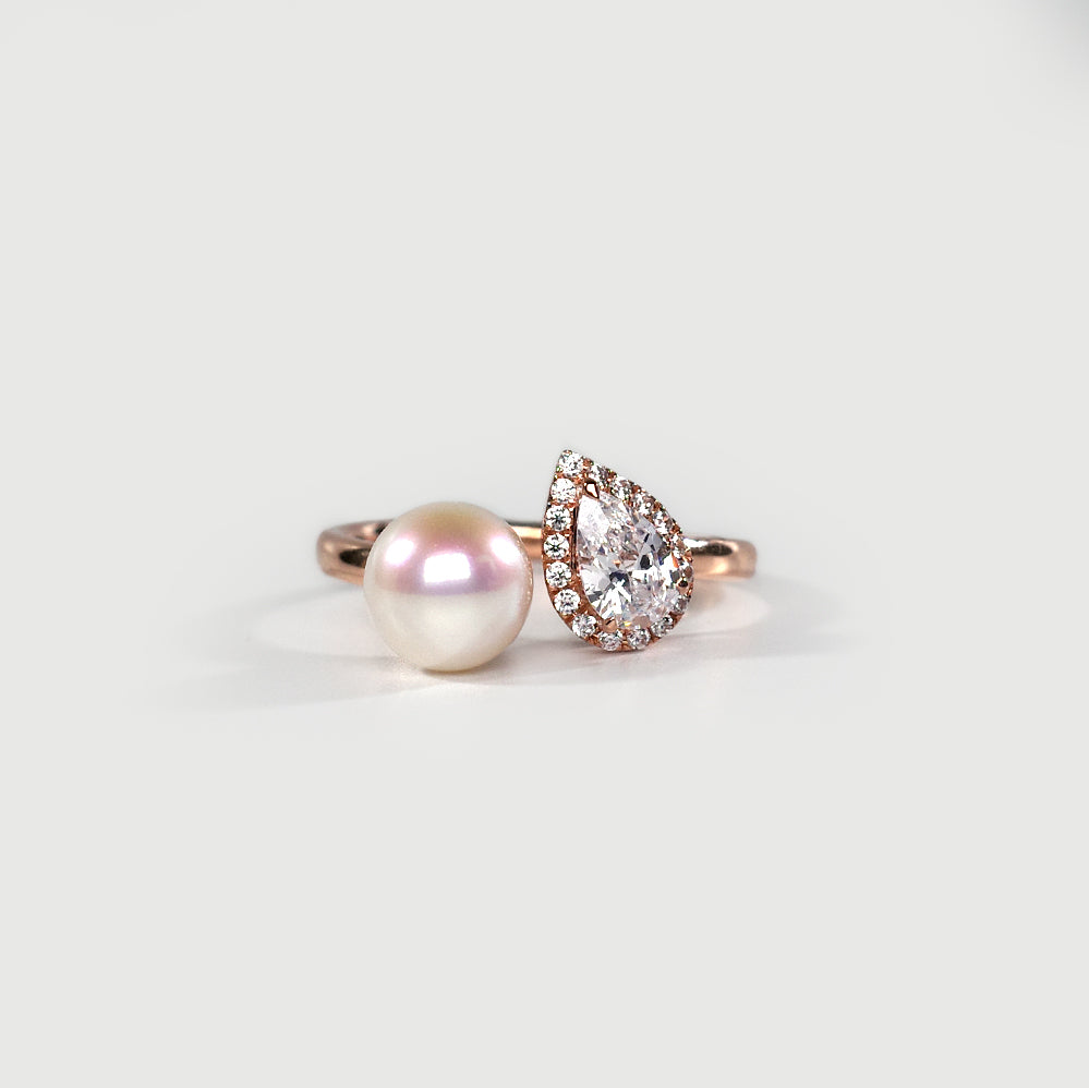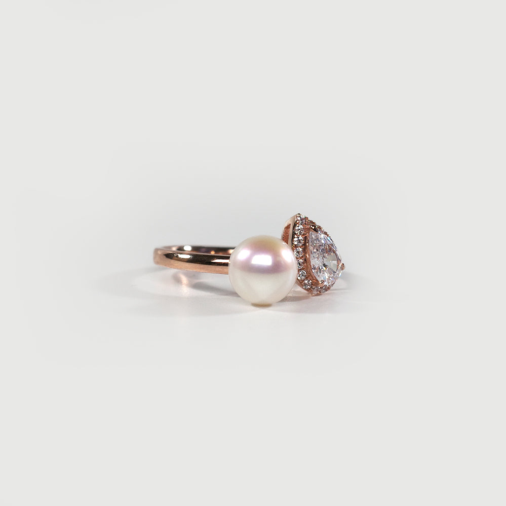 This unique Toi et Moi ring features a harmonious pairing of a lustrous pearl and a dazzling pear-shaped stone. The timeless design symbolizes the union of two elements, exuding elegance and refined sophistication.