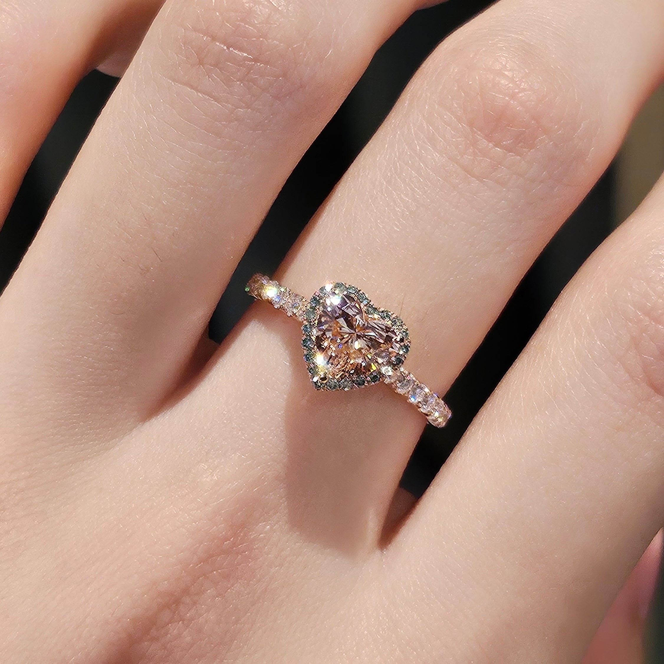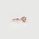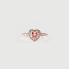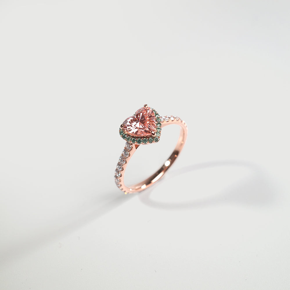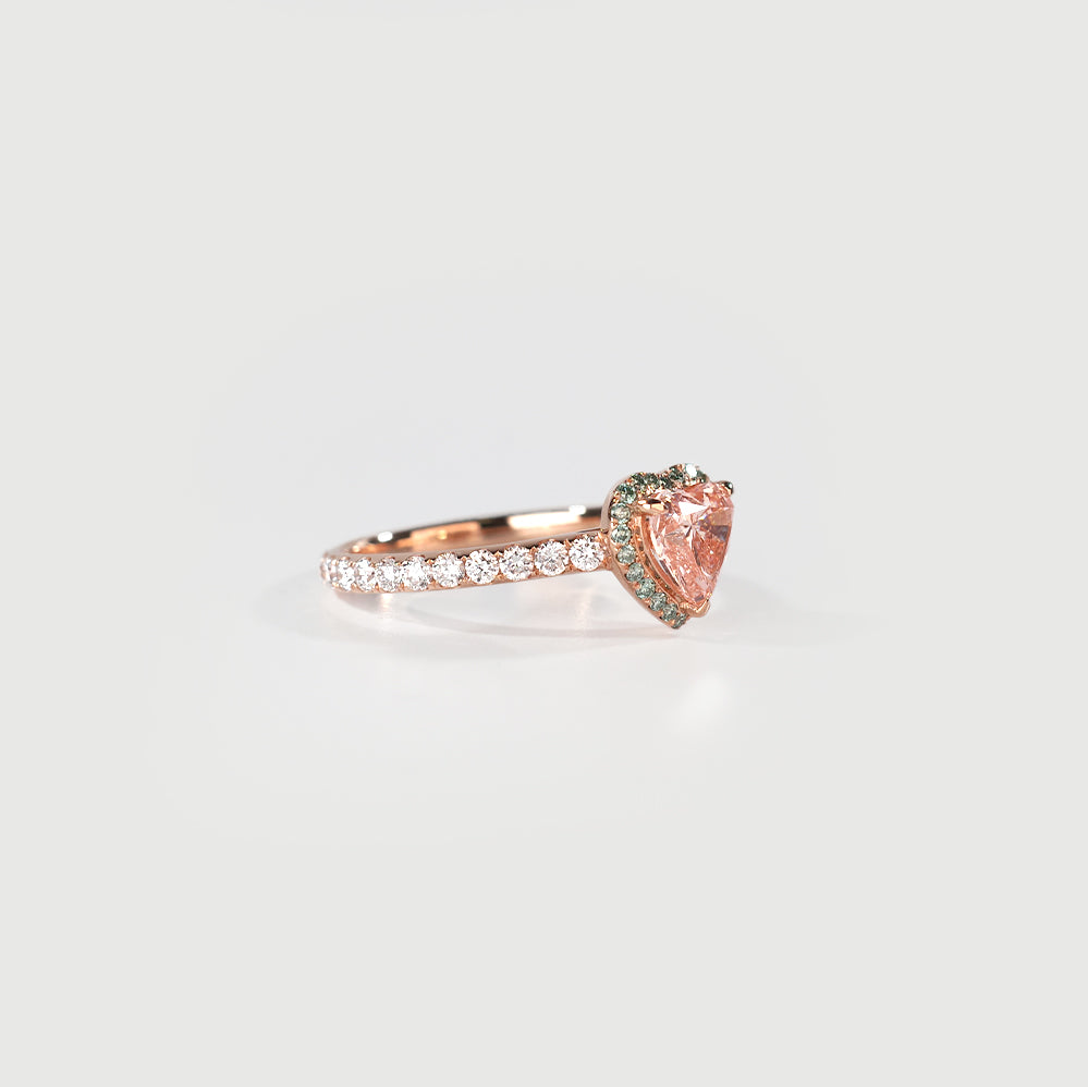 Inspired by the delicate beauty of a pink rosebud in spring, this ring features a heart-shaped pink diamond at its center, embraced by a halo of vibrant green diamonds, evoking the fresh bloom of nature’s renewal.