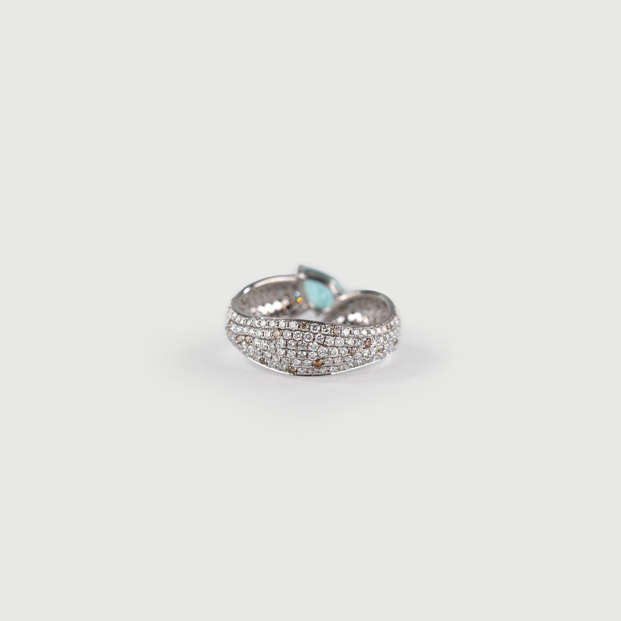 A custom made piece dedicated to the nature. Inspired by the exotic species, Zebra Dove, featuring precious and rare Paraiba turmaline and diamonds.