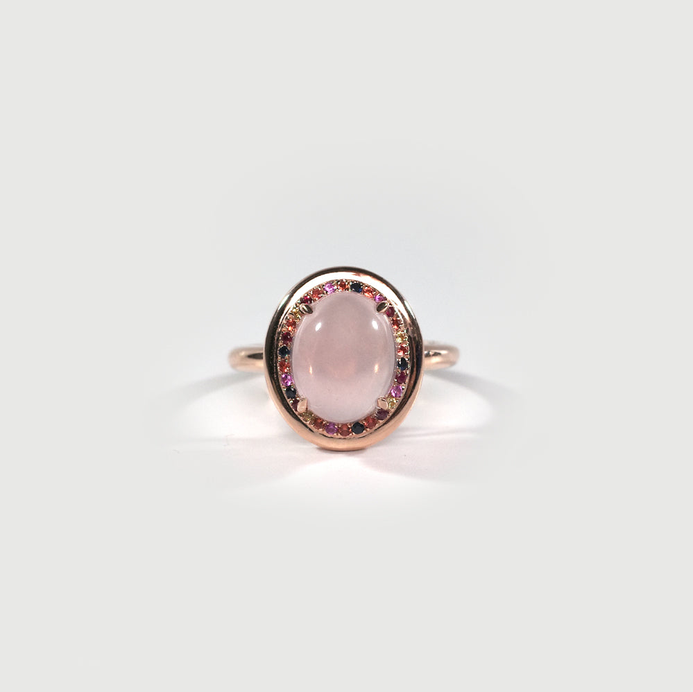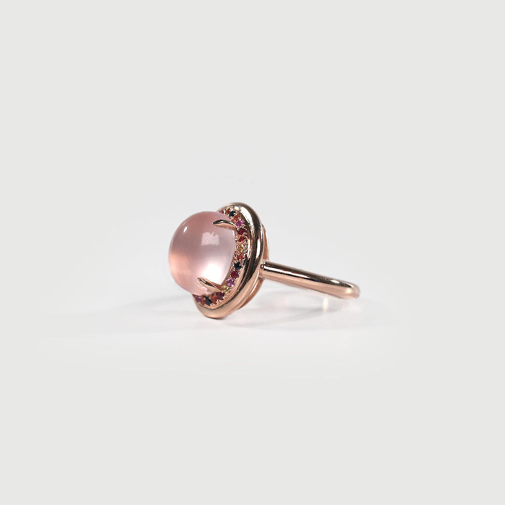 This pink quartz ring, framed by a sapphire halo, is set in a bold golden pebble design. Effortlessly blending classic elegance with modern artistry, it exudes a unique charm with its striking textures and vibrant hues.